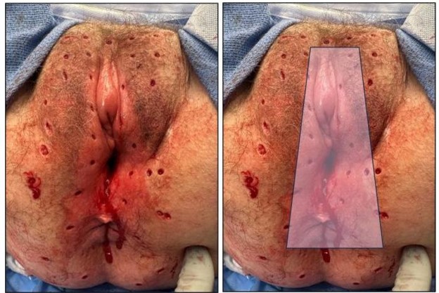 In July 2024, in the absence of visible vulvo-vaginal pathology and ongoing symptoms, patient underwent targeted gynecologic biopsies which confirmed pagetoid recurrence of urothelial carcinoma of the right lower vulva. PET-CT and MRI confirmed no extrapelvic evidence of metastases. She was then taken to the operating room for mapping biopsies to assess extent and distribution of cutaneous recurrence along the vulva, perineum and anus (Figure 1a). On interval examination, clitoromegaly was now obvious with a blooming vulvar erythema expanding to perineum and circumferentially on the anus, which presented positive for Pagetoid spread on final section (Figure 1b). In October 2024, following Gynecologic Oncology tumor board consensus, she underwent posterior pelvic exenteration including total radical vulvectomy, clitorectomy, completion vaginectomy, end colostomy, and myocutaneous flap reconstruction. Final pathology demonstrated invasive carcinoma into the clitoris and right vulva with pagetoid spread of the carcinoma affecting the left and right vulvar skin, introitus, and perianal skin extending into anal canal up to the pectinate line. Peripheral skin, vaginal and colonic margins were all negative.