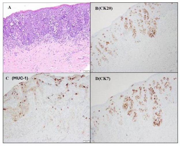 The primary biopsy displayed morphological characteristics indicative of urothelial carcinoma with pagetoid changes in the underlying squamous mucosa with cells positive for CK20, MUC-1 (Figure 2), GATA-3. Focal lymphovascular space invasion was identified. Immunohistochemical stains noted positivity for GATA-3, CK7, CK20, MUC1, and p63, while negative for uroplakin and CK5/6. This staining profile is well-documented in cases of secondary Paget's disease. Despite uroplakin negativity, tumor cells showed reactivity for MUC1, consistent with the stage and aggressiveness of the tumor, as described in the literature. The right periclitoral area displayed 1.5 cm area of invasion with a margin of 1.5 cm from the right and posterior skin. The pagetoid region displayed negative skin margins .