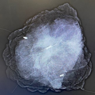 Which performed under general anesthesia with selective intubation intraoperative mammogram was done after the resection confirming the clip at the center of the specimen.