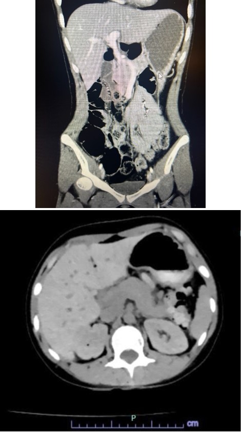 In the ED, labs and imaging studies were done to further assess her acute abdominal complaints. CBC was within normal limits and CMP revealed hyponatremia and hypokalemia. Urine pregnancy test and infectious disease workup were negative. CT abdomen with IV contrast revealed loops of small bowel and mesentery coursing between the celiac artery and portal vein with thinning and stretching of the main portal vein (Figure 1a). These findings suggested evidence of a foramen of Winslow hernia. General surgery was consulted and an operation was initially planned. However. upon repeat evaluation, the patient reported her pain and nausea had completely resolved. Review of systems, vitals, and physical exam at this time were completely negative. Repeat CT revealed oral contrast present throughout the small bowel without abnormal dilation (Figure 1b). These findings suggested spontaneous resolution of the suspected hernia. The plan at this time was to repeat labs and lactate, trial oral intake, and proceed with watchful waiting for recurrence/worsening of symptoms and clinical condition.