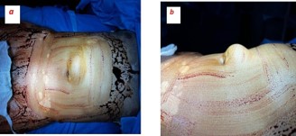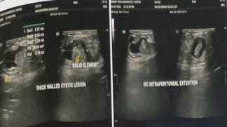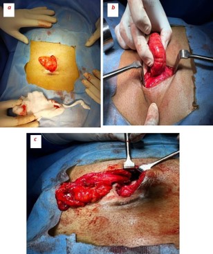 Omphalo-mesenteric duct cysts are typically diagnosed in infancy or childhood, and their occurrence in elderly is exceedingly rare [3,5]. The age of our patient is 63 years, which is probably the eldest reported case of symptomatic OMD cyst in world literature. The OMD remnants has varied clinical presentation: it may present as acute abdominal conditions viz volvulus, intestinal obstruction, complicated hernia and meckel’s diverticulitis or chronic conditions like pain abdomen, rectal bleeding, umbilical fistula and umblical hernia. Our patient reported as complicated para-umblical hernia with painful and irreducible content. Ultrasonography and CT scan of the abdomen aid in diagnosis, but sometimes it adds to the confusion and final diagnosis is made only on surgical exploration. In our case, clinical and Ultrasound examination both were strongly suggestive of para-umblical hernia with omentocoel, hence CT abdomen was not asked for and patient was straight-way taken-up for surgical exploration and the diagnosis was confirmed only during laparotomy. Management of symptomatic OMD cyst is complete surgical excision, either laparoscopically or by open surgical approach, which serves both diagnostic and therapeutic purpose. The choice of surgical approach is usually dictated by the clinical condition of the patient, pre-op diagnosis and surgeon’s expertise [2,3]. In this reported case, the decision for an open surgical approach was guided by the clinical and radiological suspicion of complicated para-umbilical hernia, surgeon’s expertise as well as patient’s preference. The diagnosis was further substantiated by HPE report, which makes it a rarest of rare presentation of OMD cyst as a complicated para-umblical hernia in an elderly male.
