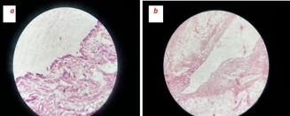 A 63-year-old male, farmer by occupation, presented with complaints of painful, irreducible, swelling in supra-umblical region since past four days. Both the symptoms observed simultaneously after lifting heavy weight. Pain was persistent, localized over the swelling and has mild to moderate in intensity. It was not associated with fever, vomiting, abdominal distension, constipation or obstipation. Patient did not have any history of previous abdominal surgery or ventral hernias. General physical examination was unremarkable. Abdominal examination revealed a 6 cm × 4 cm, well defined, firm, globular and tender swelling in mid-line just above the umbilicus (Figures 1a & 1b). There was no local rise of temperature and skin over the swelling was normal. Rest of the abdomen was scaphoid, nondistended, soft, nontender and bowel sounds were normal over all four quadrants of abdomen. Urgent laboratory investigation revealed leucocytosis (TLC12000/Cmm) with Neutrophil count of 80%. Other haematological and bio-chemical parameters were within normal limits. There was no dilated bowel loops, abnormal air-fluid levels or gas under diaphram on X-Ray chest and abdomen. Ultrasound abdomen, done at an outside centre, showed an extra-peritoneal cystic mass (Figure 2) without intraperitoneal extension, repeat ultrasound at our centre revealed a 13.6 mm size defect in anterior abdominal wall in supra-umbilical region with herniation of omentum and anechoic fluid collection in hernial sac suggestive of irreducible para-umblical hernia with omentocoele. In view of clinicoradiological suspicion of complicated ventral hernia, patient was taken up for emergency exploration under general anaesthesia via supraumblical mid-line incision. A ventral defect of approx 1.5 cm size was noticed in mid-line through which a cystic swelling of 6 cm × 5 cm was found protruding out which was attached to the ileum with a fibrous band (Figures 3a & 3b). The size of ventral defect was increased to deliver the content which was found attached to ileum with a fibrous band. The cyst along with its band was carefully dissected off the bowel, specimen (Figure 3c) was sent for histo-pathological examination, bowel was replaced back into the peritoneal cavity and ventral defect was repaired using nonabsorbable suture. Post op period was uneventful, patient was started on orals in the evening of surgery, discharged on 3rd post operative day and skin sutures were removed after ten days. Histopathological examination of specimen was reported as a unilocular cyst cavity lined by mesenteric type epithelium. The lining epithelium was surrounded by fibro-fatty tissue with psammoma bodies suggestive of OMD cyst (Figures 4a & b).
