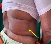 On examination, she was stable and systemically well. An ovoid swelling measuring 3×2 cm was noted on the right flank, 6 cm above the iliac crest and 7 cm lateral to the midline, just below the 12th rib. The swelling was soft, non-tender, reducible, and exhibited a cough impulse. Overlying skin was normal. Differential diagnoses considered included lumbar hernia, lipoma, soft tissue tumor, hematoma, abscess, and traumatic pseudohernia of the lumbar region [6].