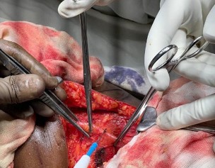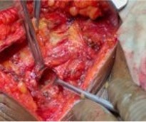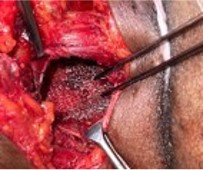 Given her symptoms and imaging findings, elective surgical repair was undertaken. Under general anesthesia, a right-sided oblique lumbar incision was made. The thoracolumbar fascia was incised (Figure 3), and the hernial sac was dissected from surrounding tissue. The herniated omental fat was reduced and the fascial defect closed. Reinforcement was achieved using a 5×5 cm polypropylene mesh placed in an extraperitoneal plane. Interestingly, a small adjacent lipoma (2×1 cm) was also excised.