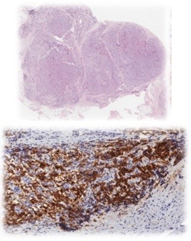 Surgical excision was considered. Fine-needle aspiration (FNA) of the paraesophageal node revealed mature lymphoid cells with low cellularity. Based on clinical and imaging findings, left lymph node dissection was performed. Histopathology confirmed parathyroid carcinoma in infraclavicular and retrocarotid lymph nodes (Figure 2).