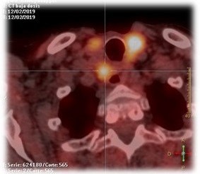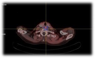 Due to disease progression, periodic PET-CT follow-up was maintained. Two years later, new hypermetabolic lymph nodes were identified, along with retroesophageal and prevertebral nodules, and biochemical relapse (calcium 13.5 mg/dL, PTH 527 pg/mL).